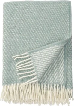 Plaid Velvet duck egg blue is een heerlijk 100% lamswollen plaid in het licht blauw, het plaid heeft aan de uiteinden witte zachte franjes, zie afbeelding. De binnenkant van het plaid is het negatief van de buitenkant.