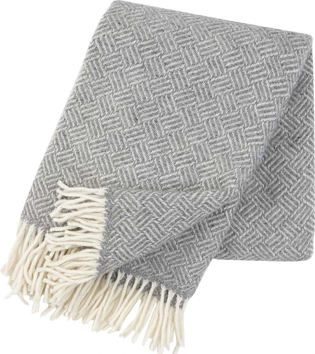 Plaid Samba grijs is een heerlijk 100% lamswollen plaid in het grijs met een ecru ingeweven motief. Het plaid heeft aan de uiteinden witte zachte franjes, zie afbeelding.