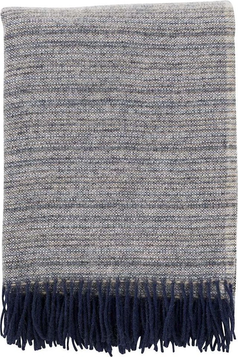 Klippan plaid wol, Plaid Alaska is een lamswollen plaid gemaakt van ecologische lamswol. Het plaid is mooi gemeleerd met een beetje grijs en antraciet en blauw tinten. De randen zijn mooi afgewerkt met blauwe franjes.