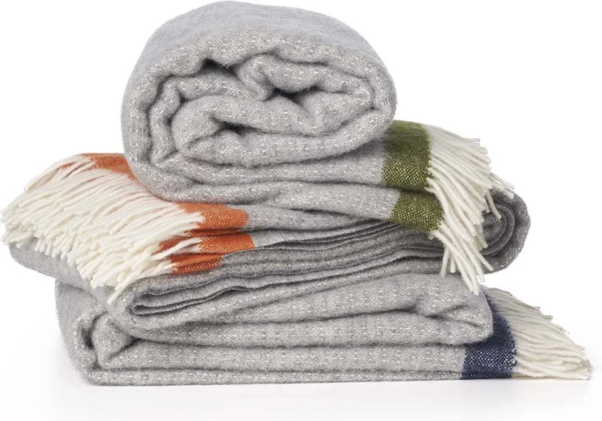 Plaid Hampus van Klippan is een heerlijk zacht plaid van ecologische lamswol. Het plaid heeft een klein ingeweven motief en is lichtgrijs met aan de twee zijdes franjes en een groene border.