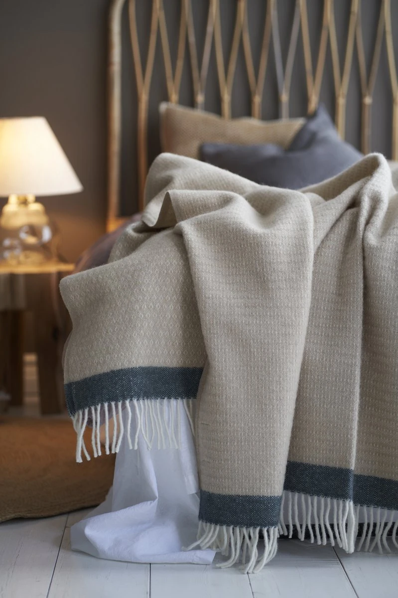 Wollen plaid Harald is gemaakt van 100% ecolamswol met een heel klein ingeweven motief en ecru kleurige franjes aan de uiteinden. De kleur is ecru/beige met aan de uitenden een baan in de kleur peytrol blauw. Wollen plaid Harald is een ruim plaid van 130 bij 200 cm (dat is inclusief de franjes), heerlijk voor op de bank, mooi op het bed en fijn op de veranda.