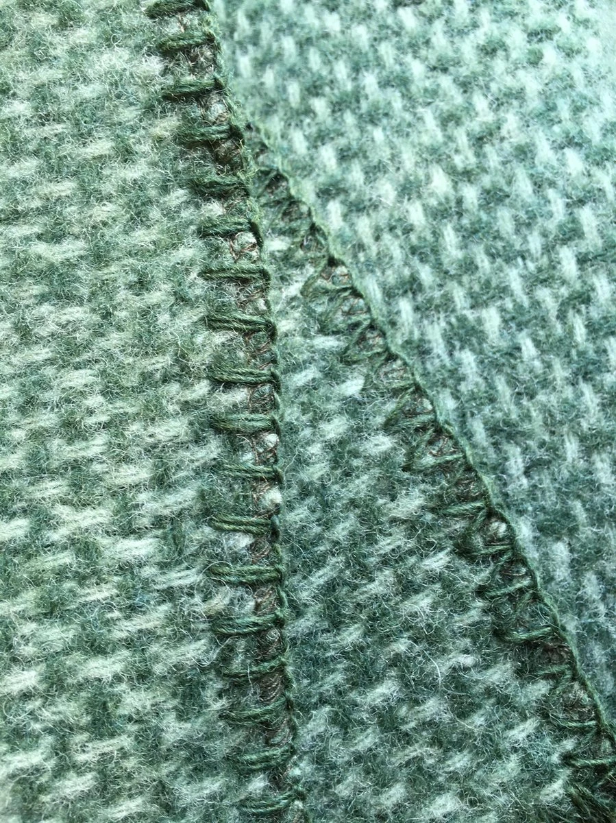 Plaid Domino is is een heerlijk 100% lamswollen plaid met een ingeweven motief in een diepe kleur groen het plaid is aan de randen mooi afgewerkt met een festonsteek, zie afbeelding.
