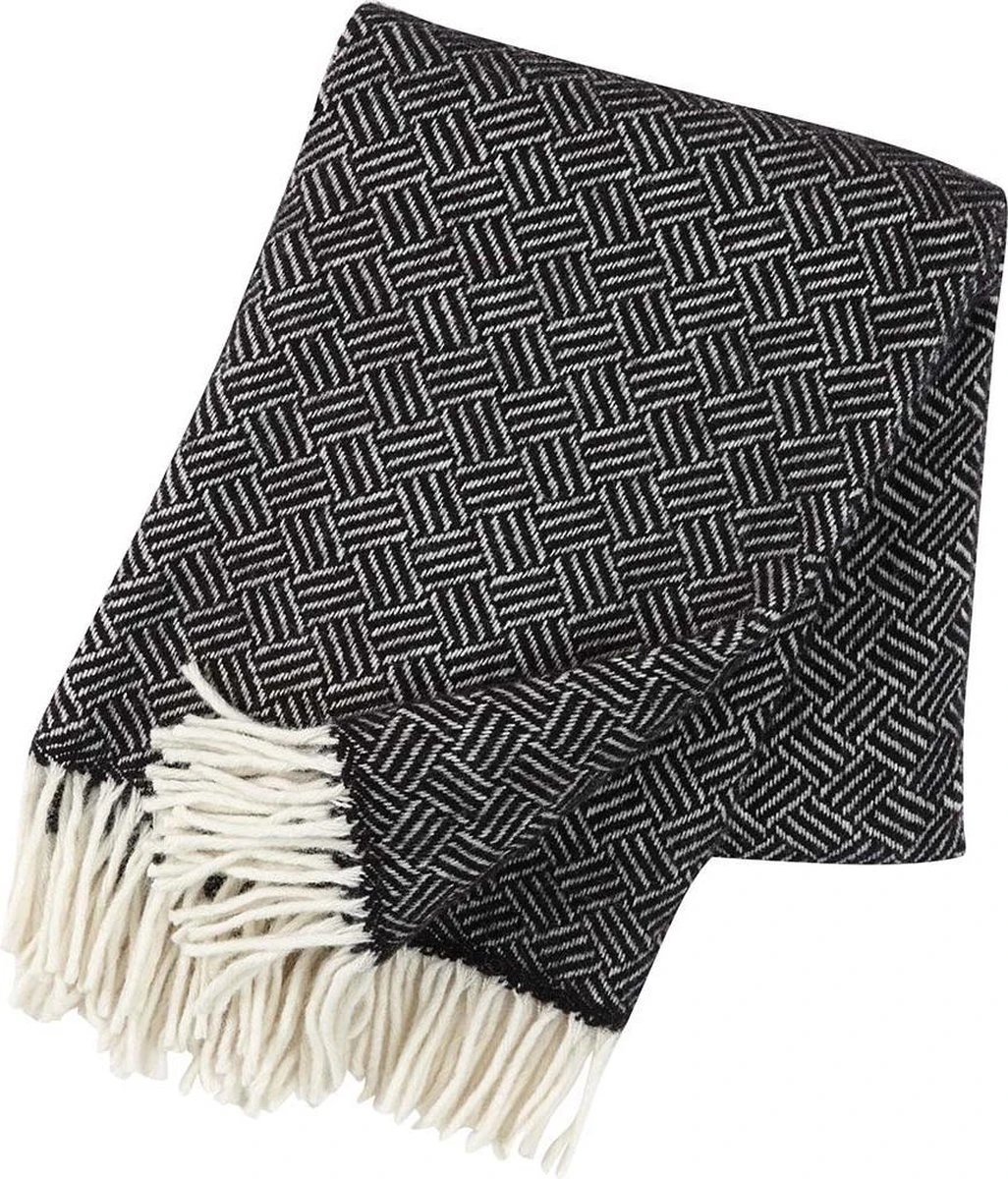Plaid Samba wart is een heerlijk 100% lamswollen plaid in het zwart met een ecru ingeweven motief. Het plaid heeft aan de uiteinden witte zachte franjes, zie afbeelding.